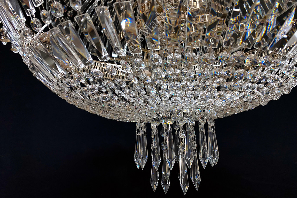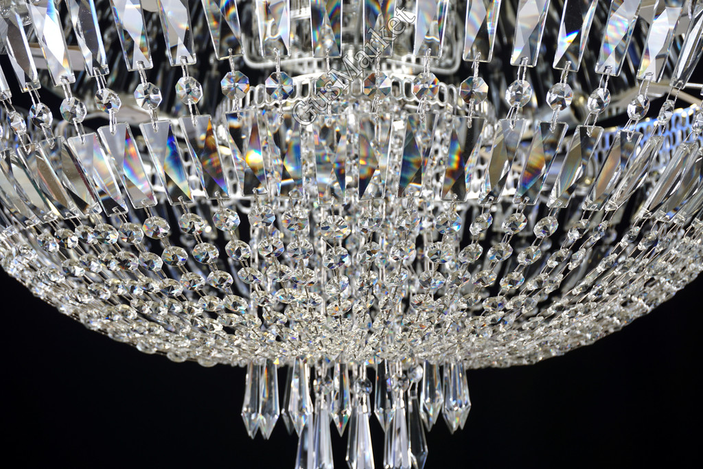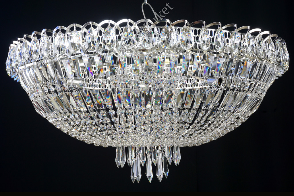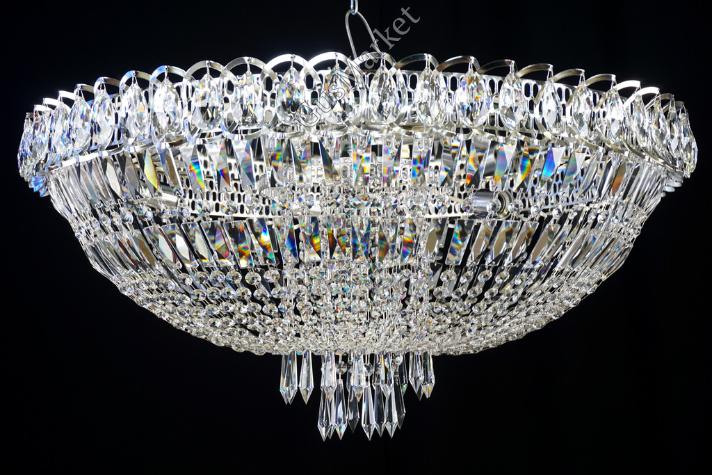 Люстра с зеркалом. Зеркало придает дополнительную игристость хрусталю и делает комнату светлей. Люстра смотрится богато. Зеркало за двойным слоем хрусталя. Хрустальные нити соединены в форме купола. Низ дополнительно украшен хрусталиками по-форме отдаленно напоминающими сосульки (перо).