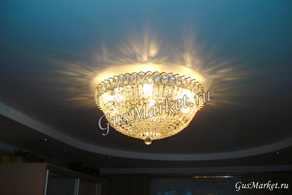 Люстра с зеркалом. Зеркало придает дополнительную игристость хрусталю и делает комнату светлей. Люстра смотрится богато. Зеркало за двойным слоем хрусталя. Хрустальные нити соединены в форме купола. Низ дополнительно украшен хрустальным шариком.
