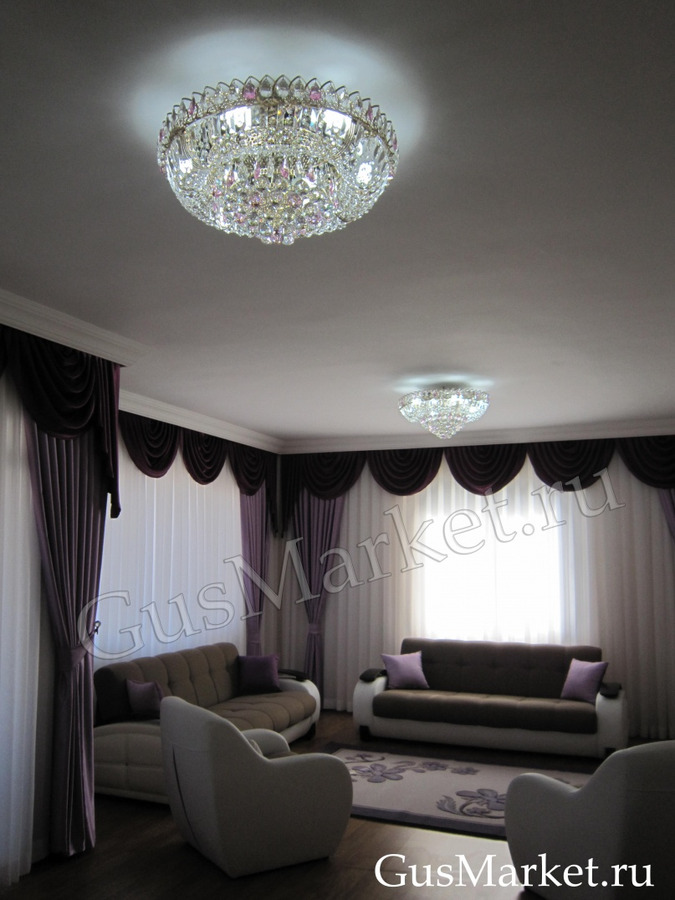 люстру подбирала под круглый потолок, с выбором не прогадала смотрится красиво, только вот крепление крючок, не совсем удобное.