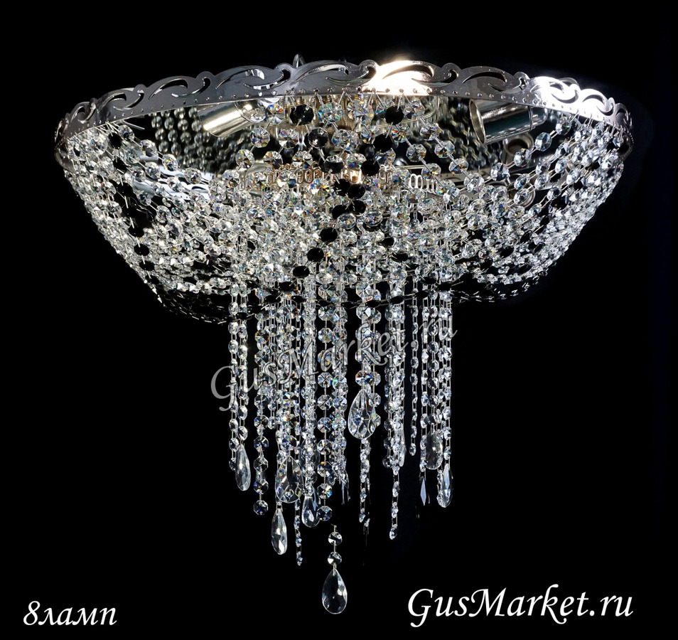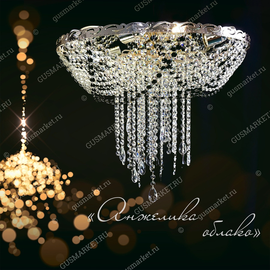 Хрустальная люстра «Анжелика облако» — ещё одна вариация люстры «Анжелика» с небольшими модификациями формы и размера, придающими индивидуальность за счёт цвета и формы хрустальных вставок. Зеркало в основании усиливает блеск хрусталя и является идеальным световым отражателем. Производство г. Гусь-Хрустальный. Можно собрать люстру разной высоты, до 1,5 м. Возможно добавление цветных хрусталиков. Крепление крючковое. Поставляется в собранном виде.
