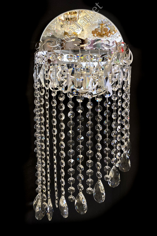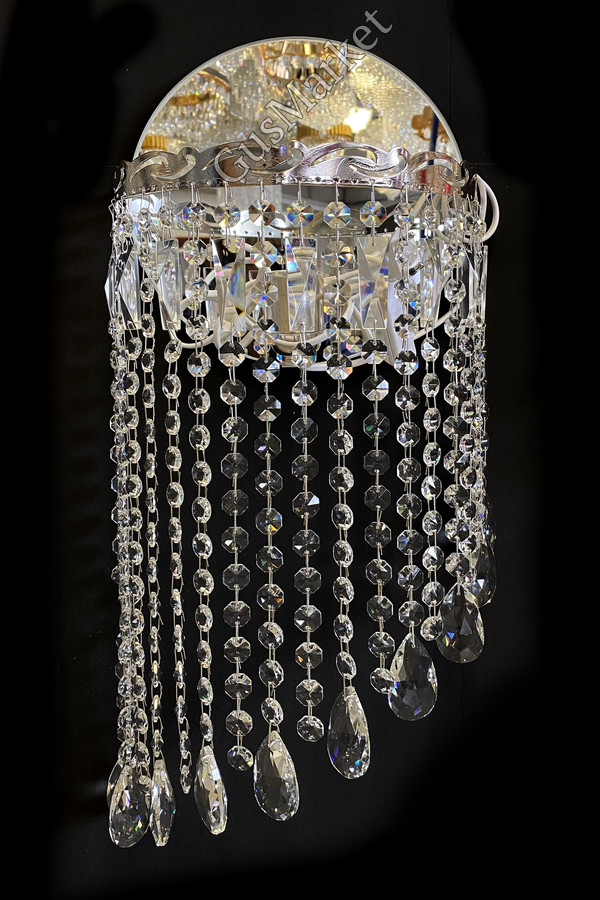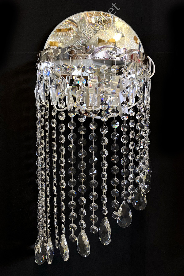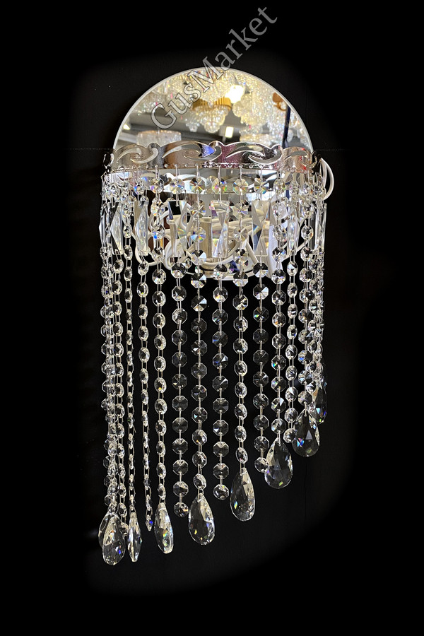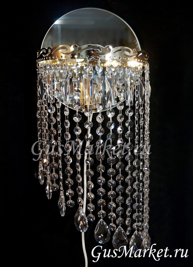Бра производства г.Гусь-хрустальный. Поставляется в собранном виде. Крепление настенное на два самореза, располагается за зеркалом. Выключатель на проводе. Провод можно обрезать и подключить к выводу из стены. Данный бра будет интересно смотреться большей высоты, можем изготовить под клиента.