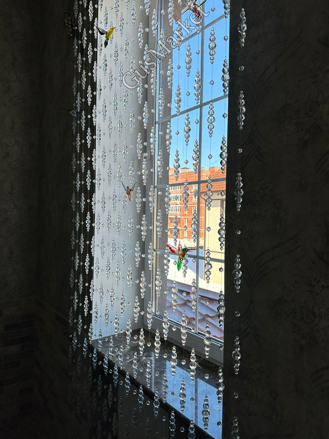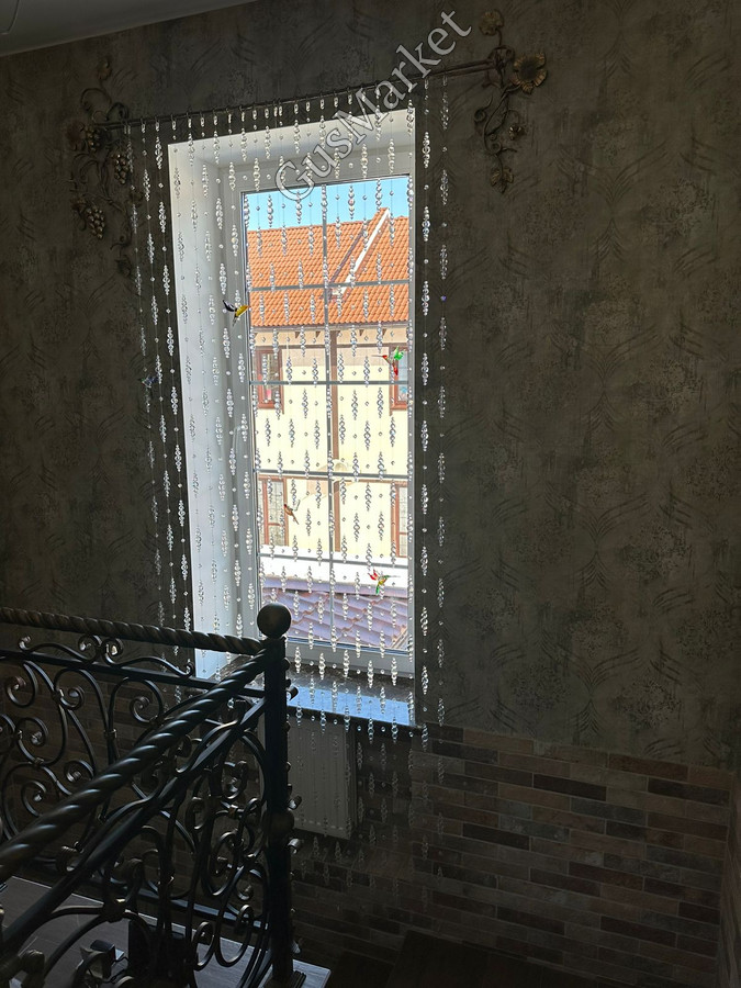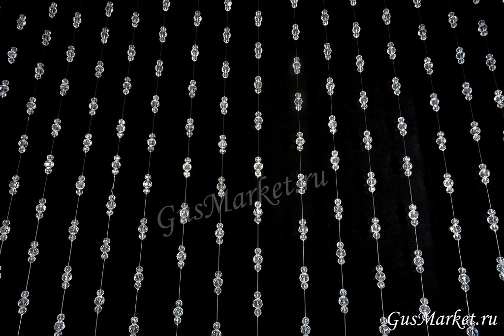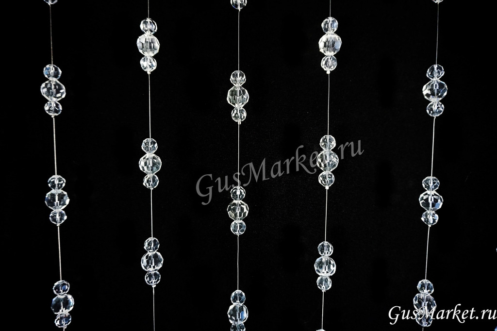 Штора из бусин, тросика и зажимов. Размер заказать можно любой, возможен "прямой" и "арочный" вариант. На данном образце расстояние между цепочками 8см, цепочки расположены в шахматном порядке, промежуток между бусинами 6см, используются бусины двух диаметров, в каждой очередности размещена бусина д14мм, д20 мм и д14мм. Цена просчитана за 1метр длинны цепочки, от количества меняется в меньшую сторону. Принимаем заказы по вашей схеме.