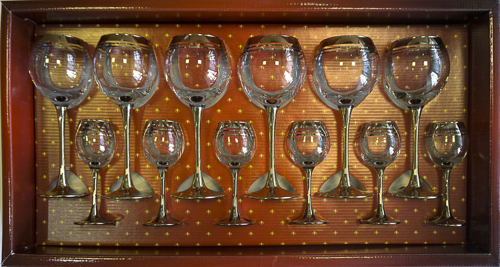 Двойной набор фужер плюс рюмка, в наборе 12 предметов. Подарочная упаковка. Материал стекло и деколь. Производство г. Гусь-Хрустальный