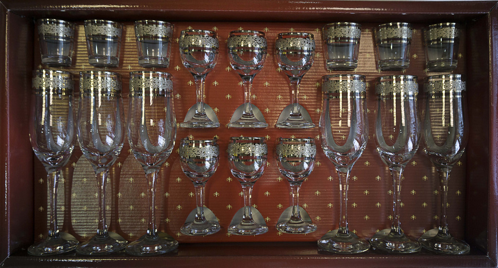 Тройной набор стопка, рюмка плюс бокал, в наборе 18 предметов. Подарочная упаковка. Материал стекло и деколь. Производство г. Гусь-Хрустальный