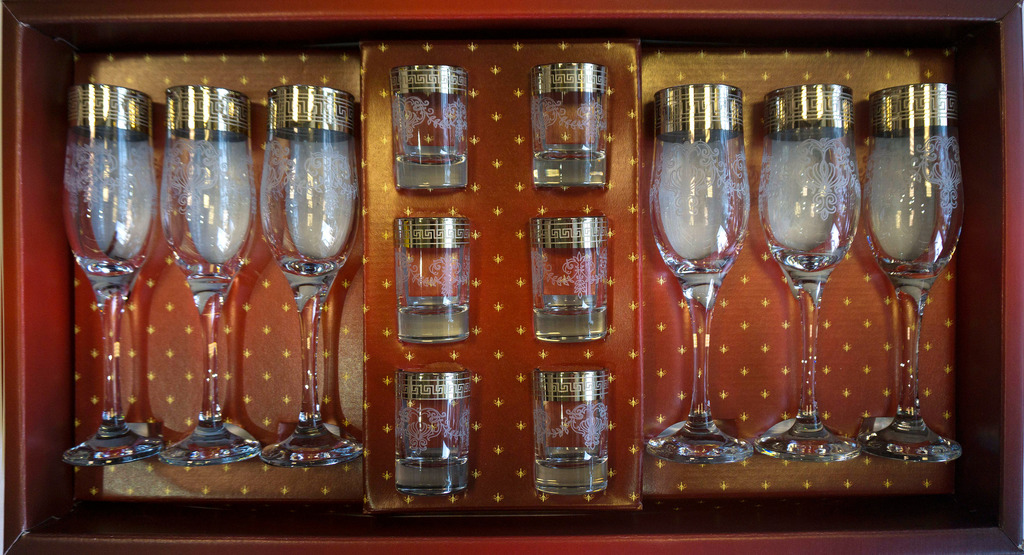 Двойной набор стопка плюс бокал, в наборе 12 предметов. Подарочная упаковка. Материал стекло и деколь. Производство г. Гусь-Хрустальный.