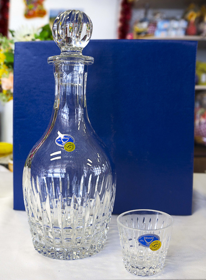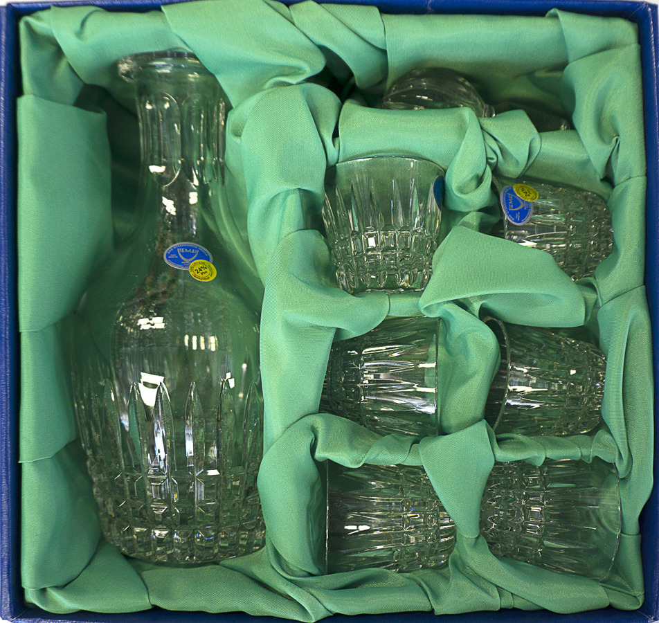 Набор из хрусталя, в подарочной коробке. В наборе 8 предметов: графин 450 мл с пробкой и 6 стопок по 35 мл.
