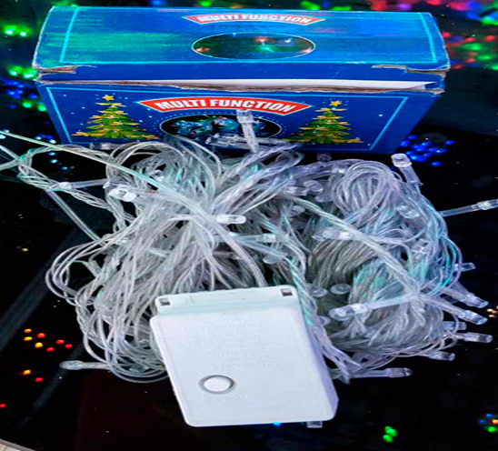 Длинна 9 метров, на 100 ламп. Можно соединить в несколько гирлянд. На изделии есть вилка и розетка.