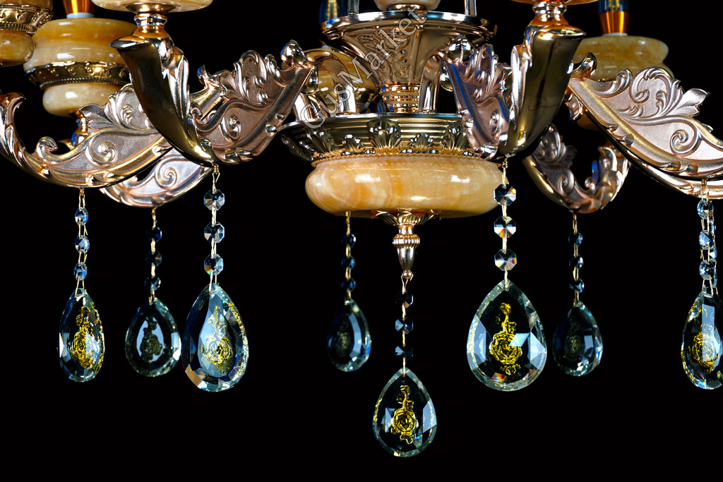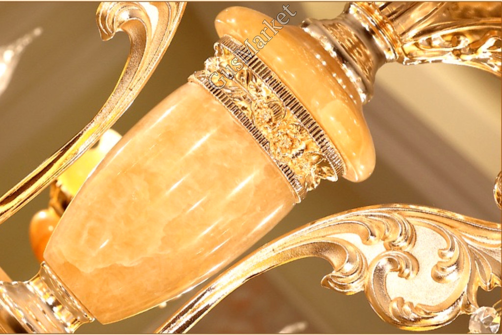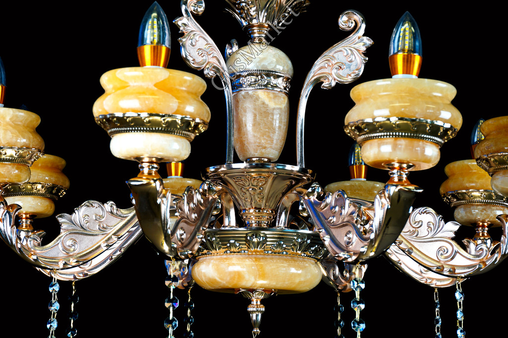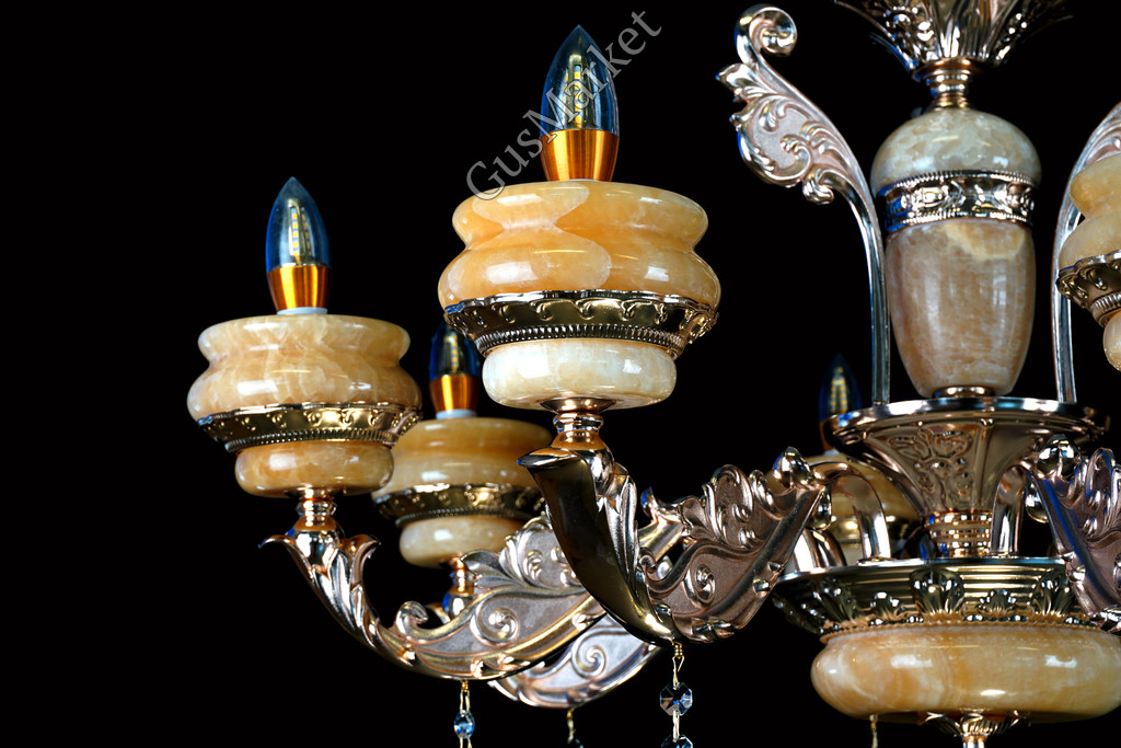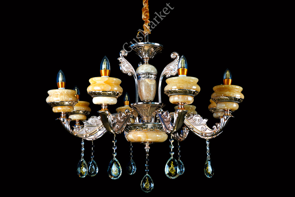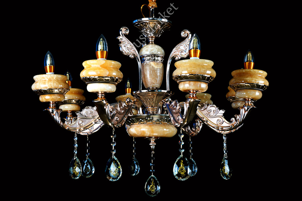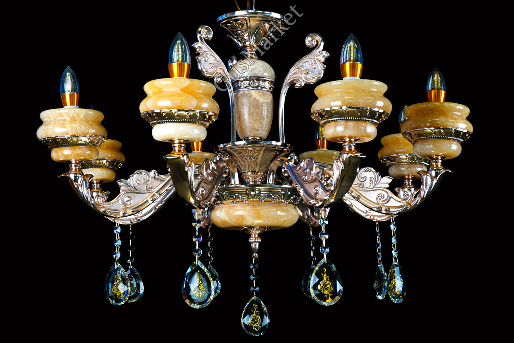 Люстра с хрусталем и отделкой камнем Оникс, на 8 лампочек. В патронах и нижнем плафоне расположена дополнительная подвеска. Поставляется в разобранном виде. Цепь можно делать короче и длиннее. Люстра производство Китай.