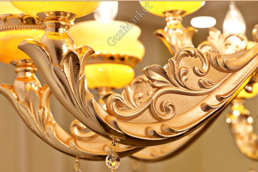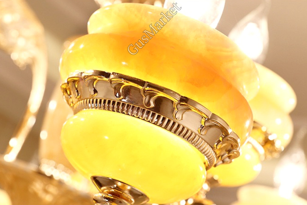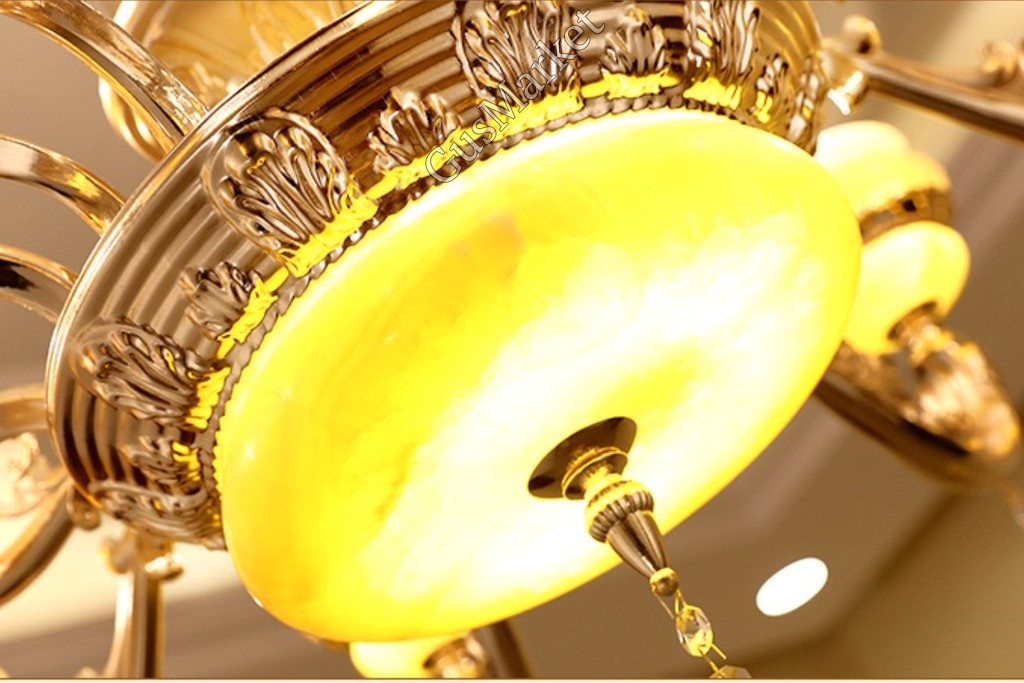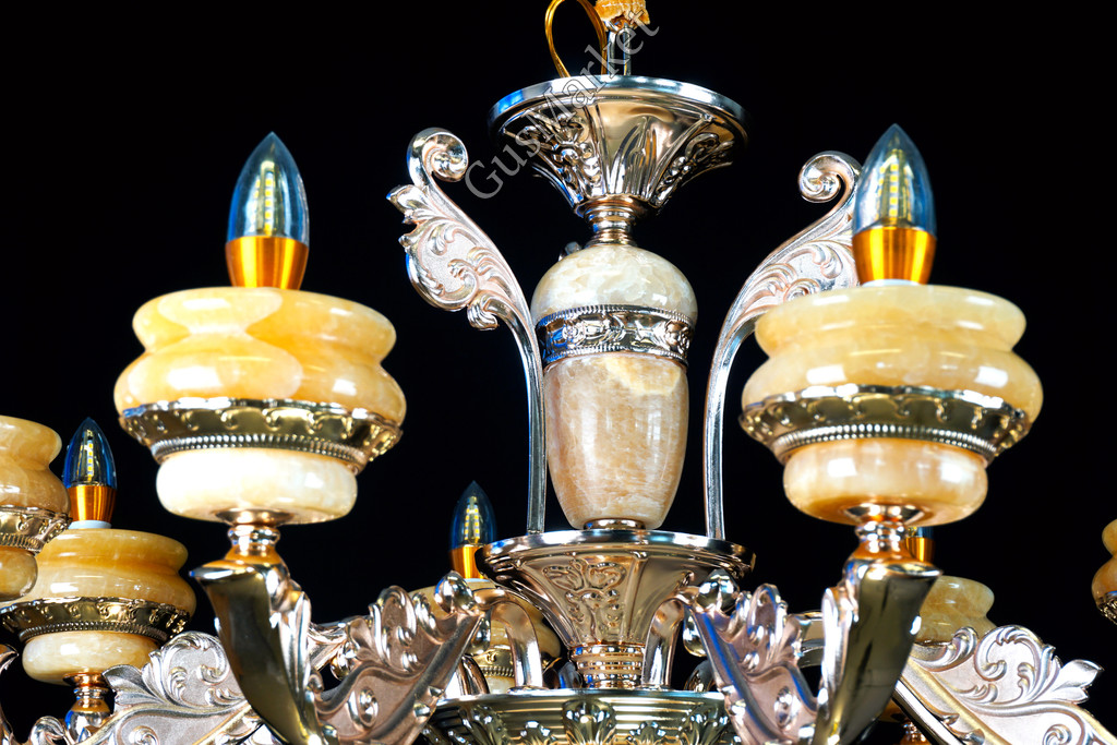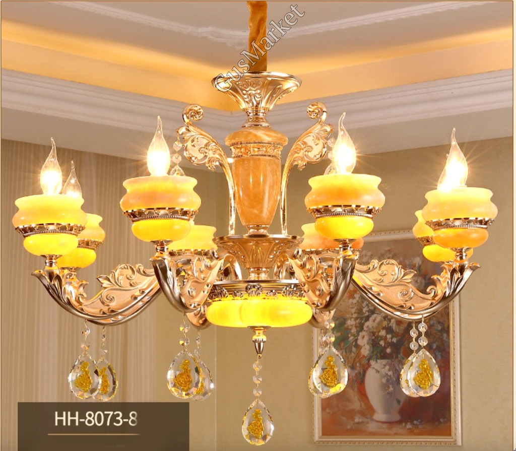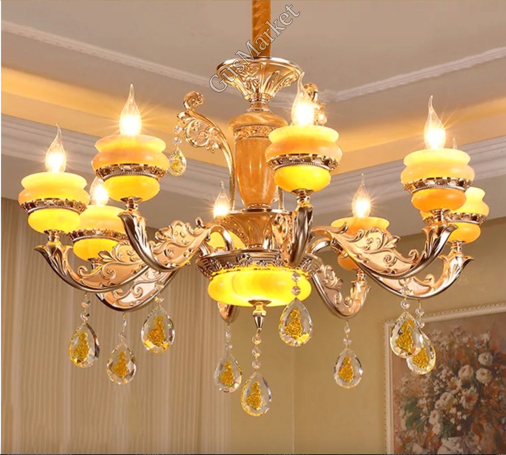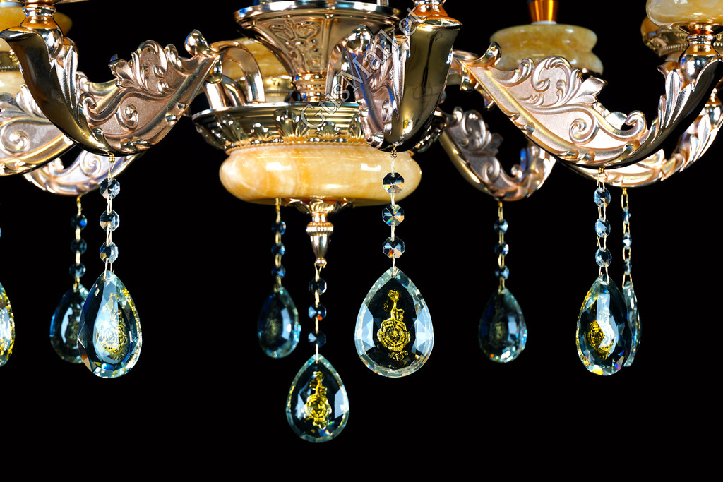 Люстра с хрусталем и отделкой камнем Оникс, на 8 лампочек. В патронах и нижнем плафоне расположена дополнительная подвеска. Поставляется в разобранном виде. Цепь можно делать короче и длиннее. Люстра производство Китай.