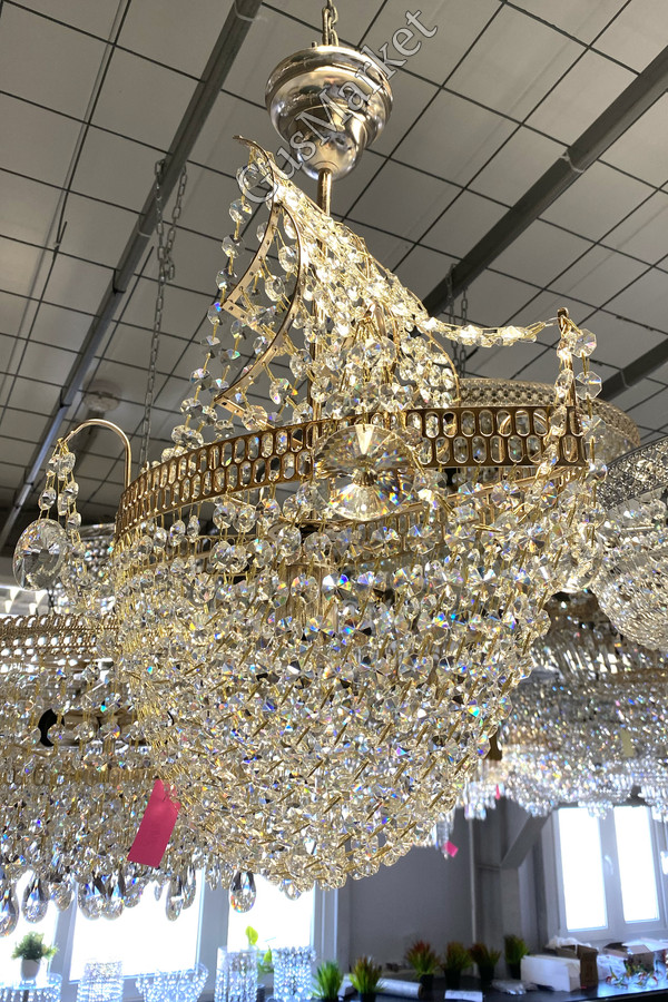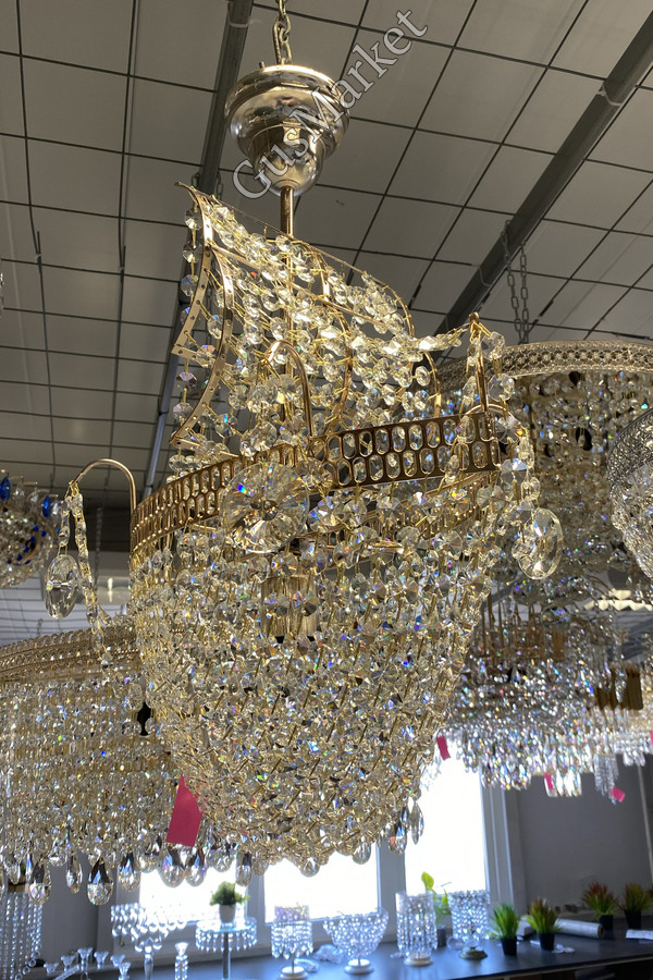 Скрепка золото. Люстра производства г.Гусь-Хрустальный. Изготовлена в форме корабля, замечательный вариант для детской комнаты. Поставляется в собранном виде. Крепление крючковое.