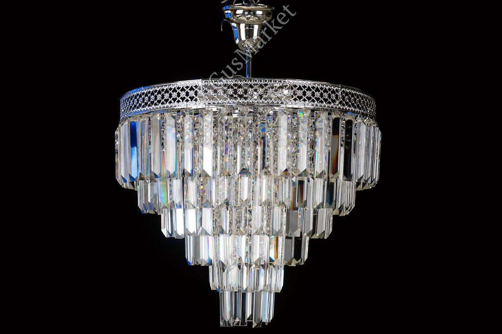Хрустальная люстра г. Гусь-Хрустальный. Крепление на крючок. Поставляется в частично собранном виде. Отдельно упаковываем хрустальные пластины. Окончательную сборку рекомендуем проводить на уже установленную люстру. Сборку следует начинать из центра, с нижнего ряда. 1й, 2й, 3й, 4й, 5й (считаем из центра) ряды - пластина устанавливается на каждую цепочку, 6й ярус (наружний) через одно отверстие.