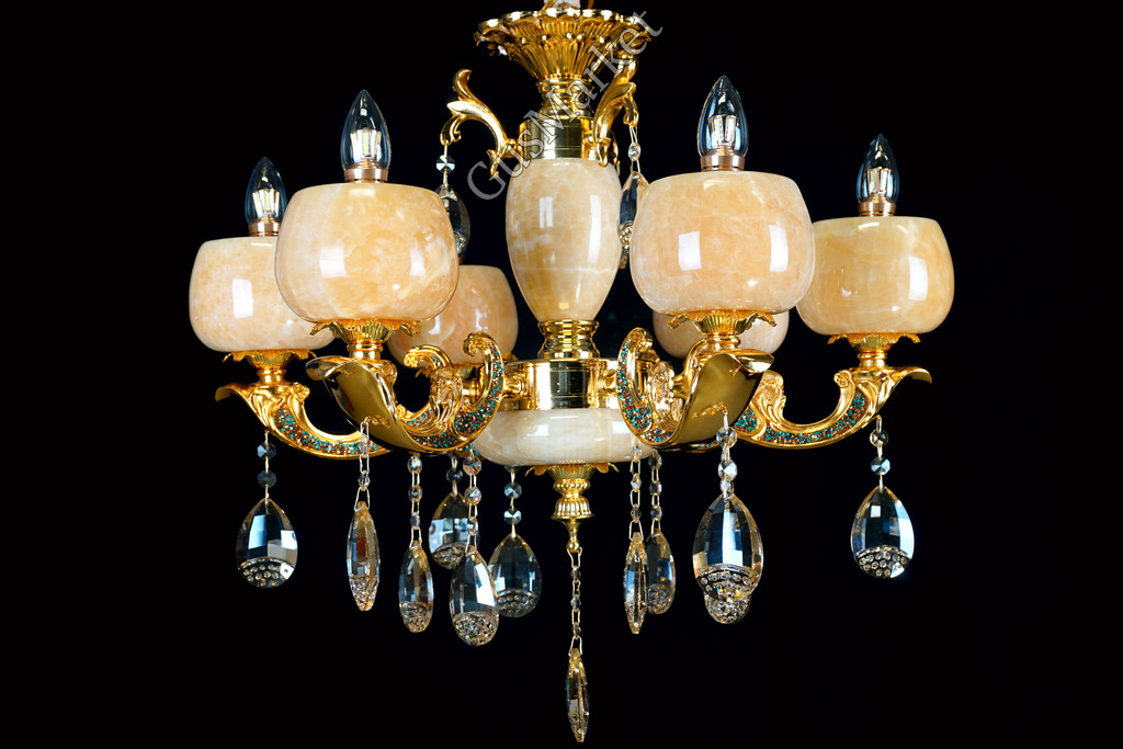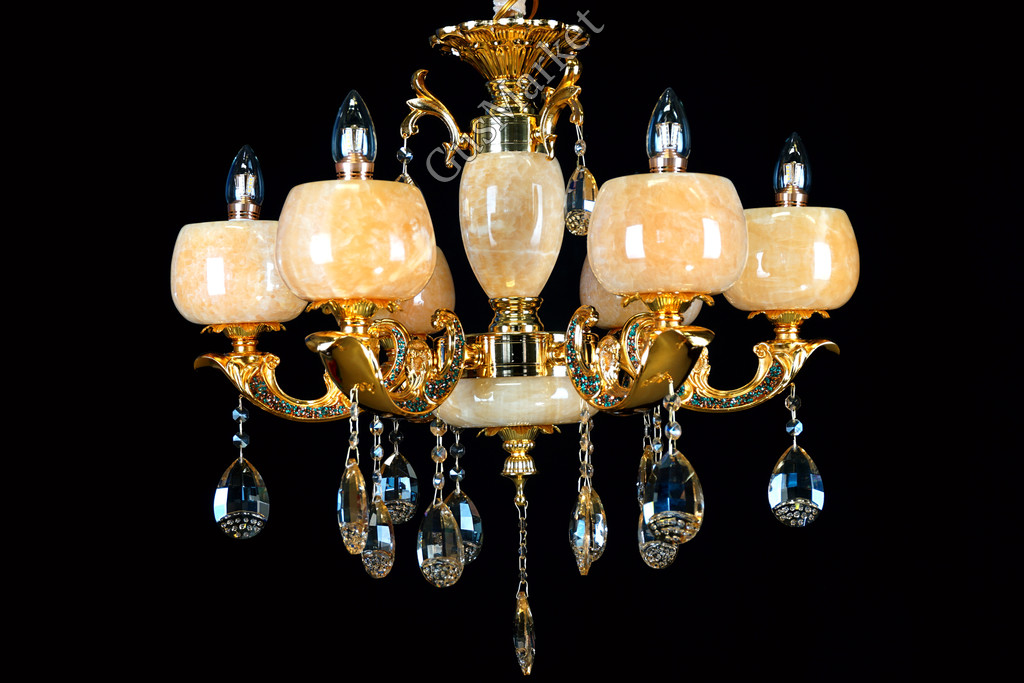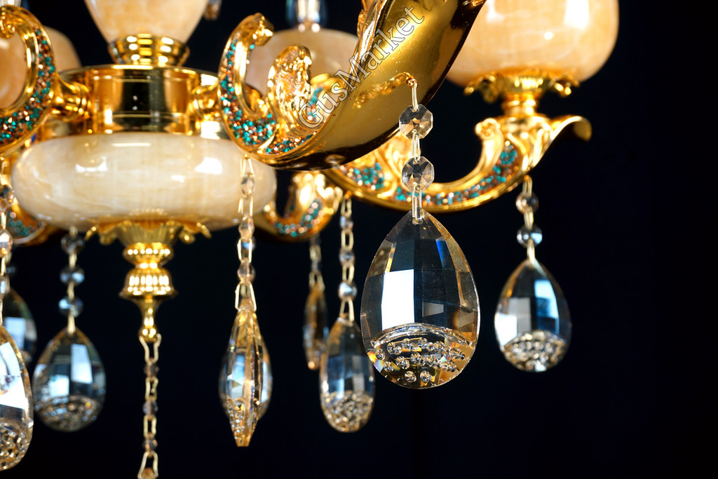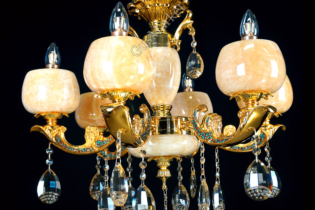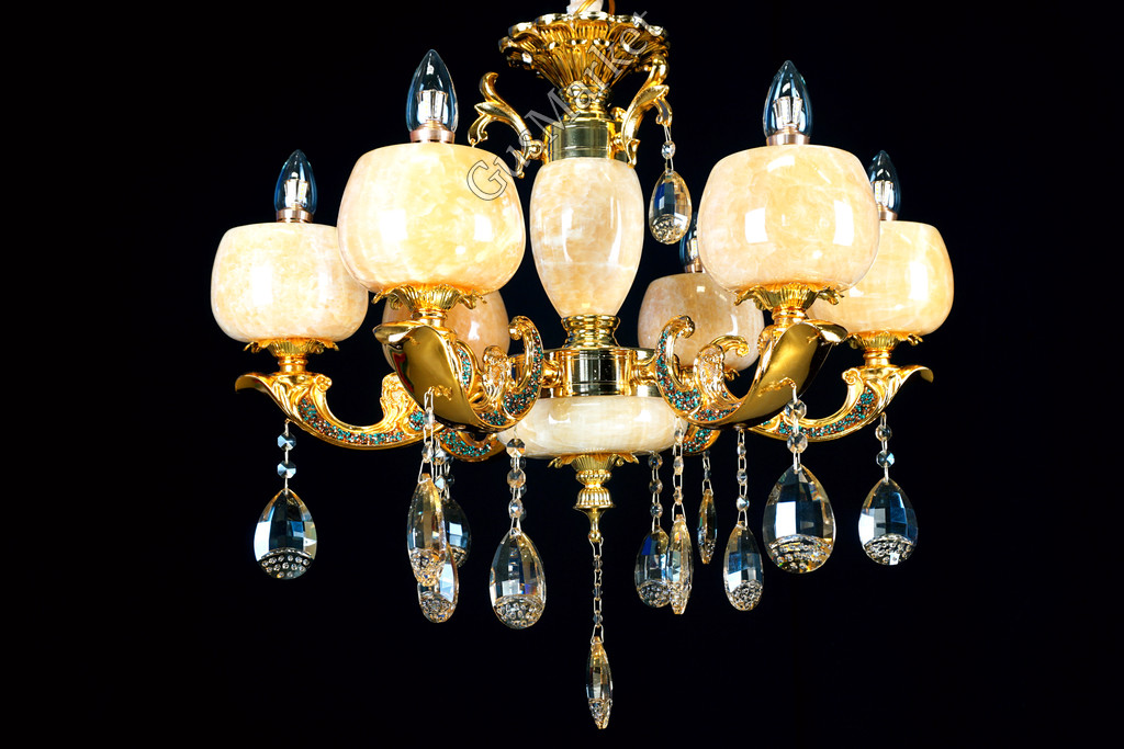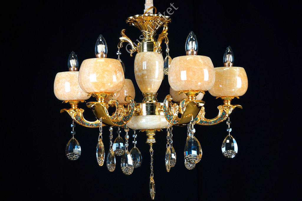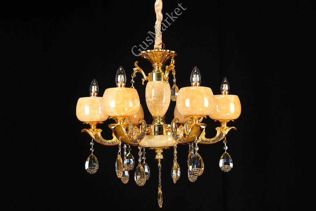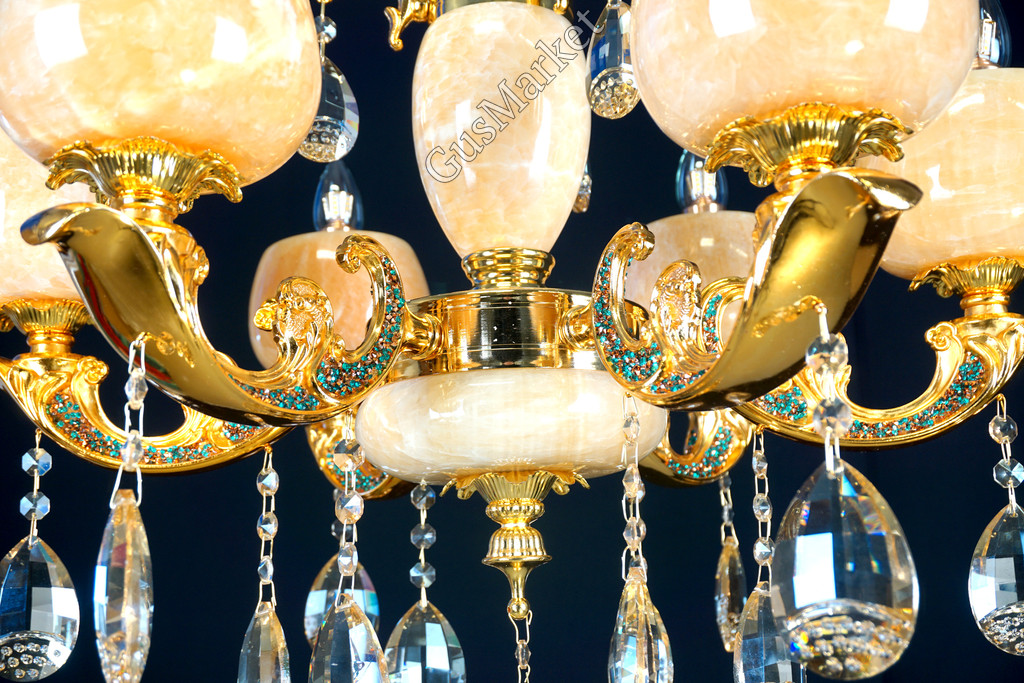 Люстра с хрусталем. В качестве отделки люстры используется натуральныйй камень, оникс. Поставляется в разобранном виде. Цепь можно делать короче и длиннее. Люстра производство Китай.