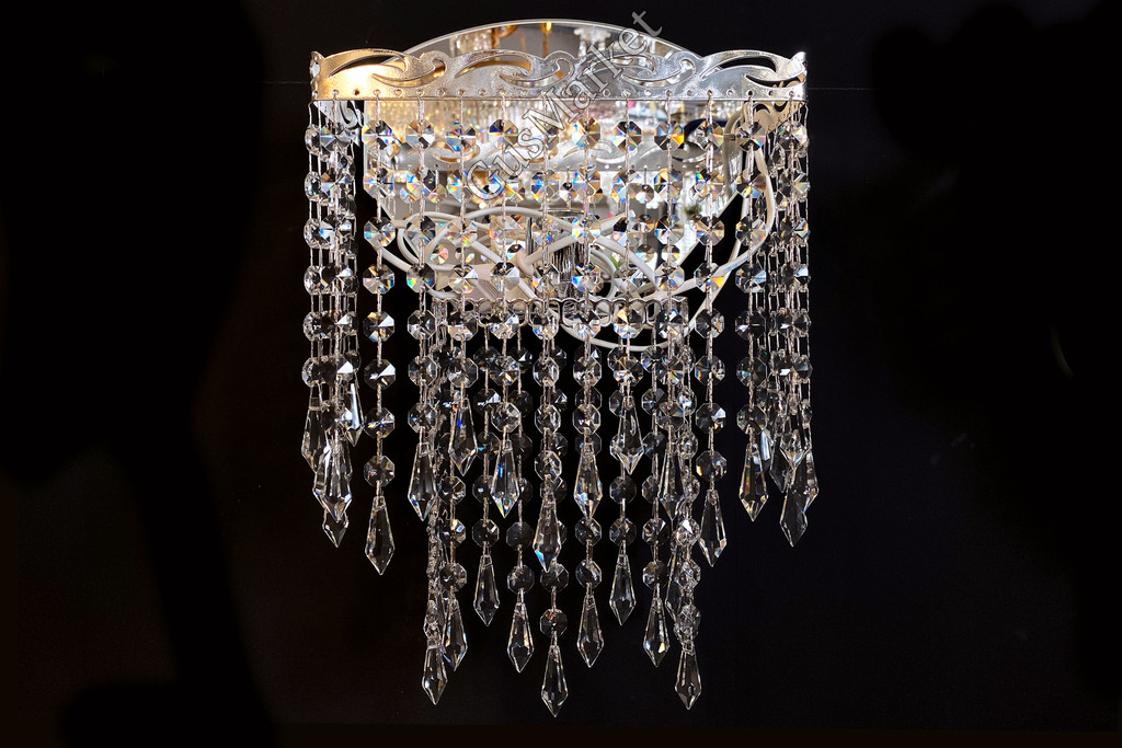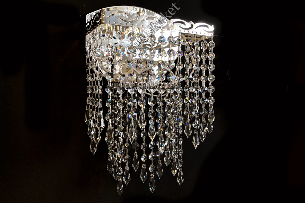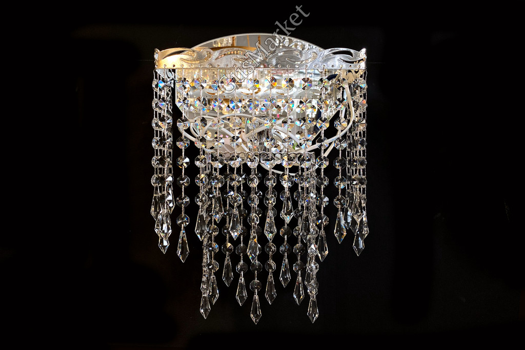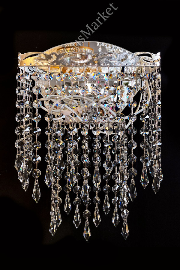 Хрустальный бра производство г. Гусь-Хрустальный. Включатель на проводе. Крепление на двух саморезах (за зеркалом). Возможно добавление цветного камня. Лампочка направлена вверх.