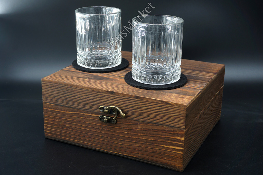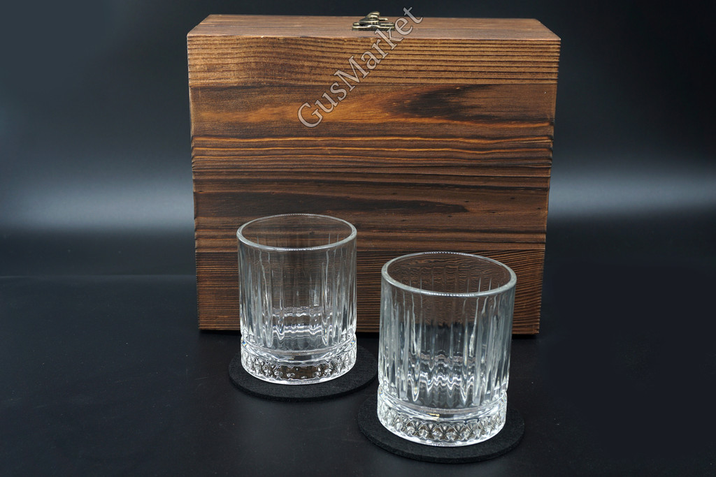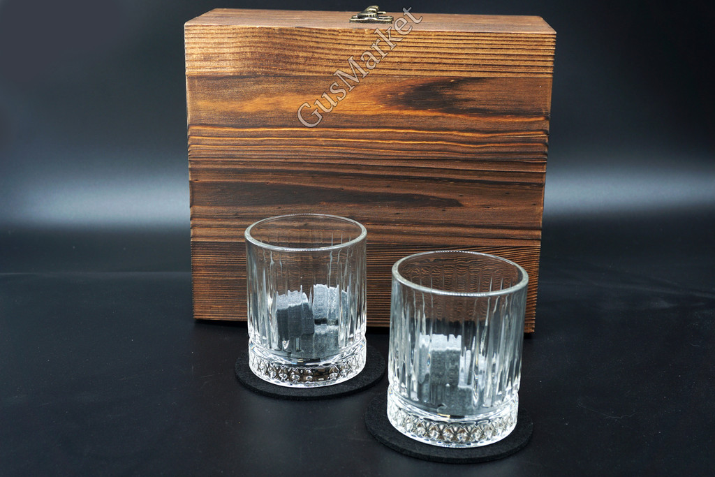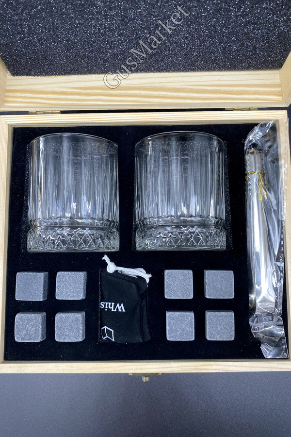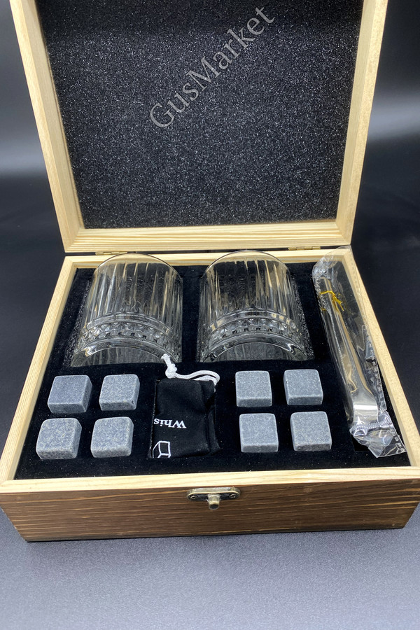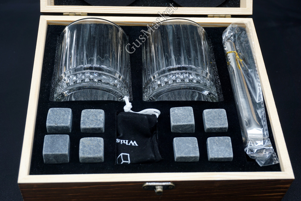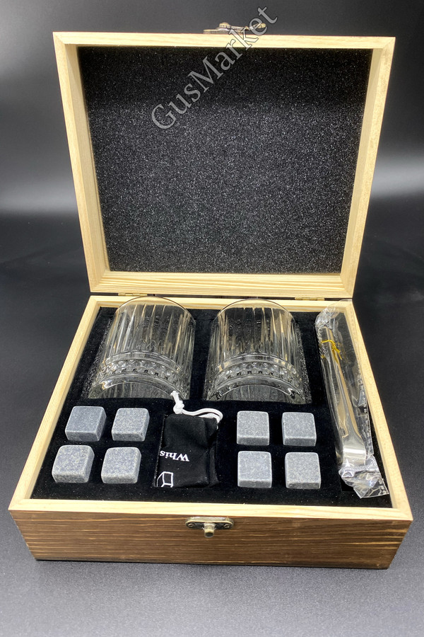 Подарочный набор для виски в коробке из сосны - отличный подарок для ценителей крепкого алкоголя. В комплекте прозрачные стаканы из стекла по 230 мл - 2 штуки, две подставки, 8 мраморных кубиков в бархатном мешочке и щипцы. Камни для виски помогают охлаждать напиток, не разбавляя водой и сохраняя его оригинальный вкус и крепость. Вы можете использовать коктейльные кубики для охлаждения любых напитков. Перед использованием промойте камни водой, поместите их в морозильную камеру на 4-5 часов, добавьте 3-4 кубика в стакан и наслаждайтесь вкусом напитка. После использования их можно хранить в мешочке.