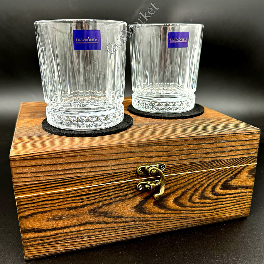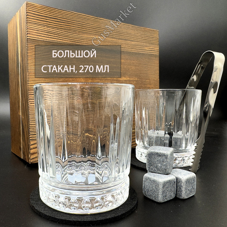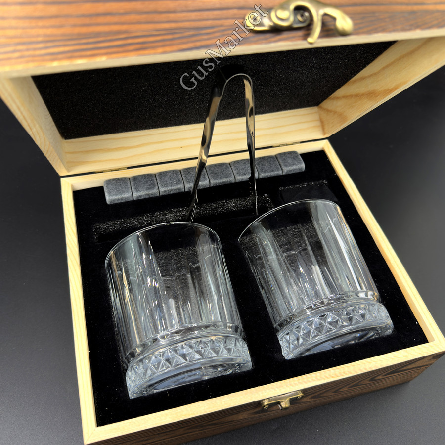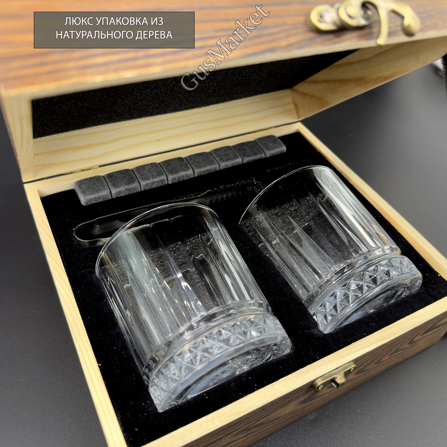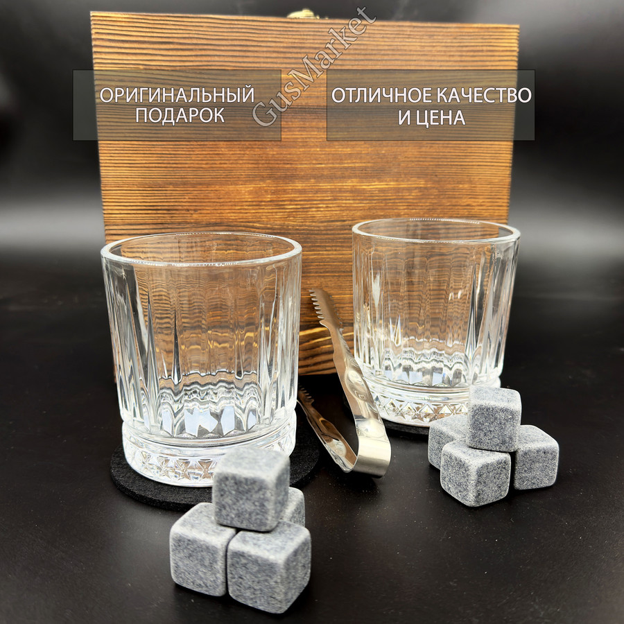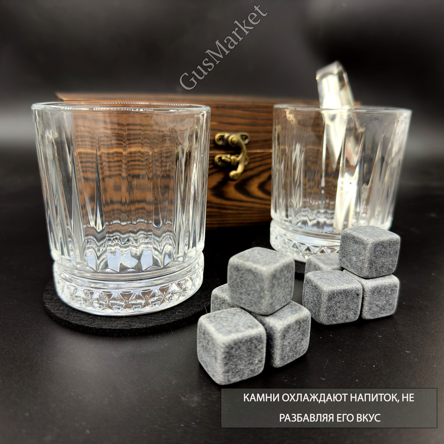 Подарочный набор для виски в коробке из сосны - отличный подарок для ценителей крепкого алкоголя. В комплекте прозрачные стаканы из стекла по 270 мл - 2 штуки, две подставки, 8 мраморных кубиков в бархатном мешочке и щипцы. Камни для виски помогают охлаждать напиток, не разбавляя водой и сохраняя его оригинальный вкус и крепость. Вы можете использовать коктейльные кубики для охлаждения любых напитков. Перед использованием промойте камни водой, поместите их в морозильную камеру на 4-5 часов, добавьте 3-4 кубика в стакан и наслаждайтесь вкусом напитка. После использования их можно хранить в мешочке.
