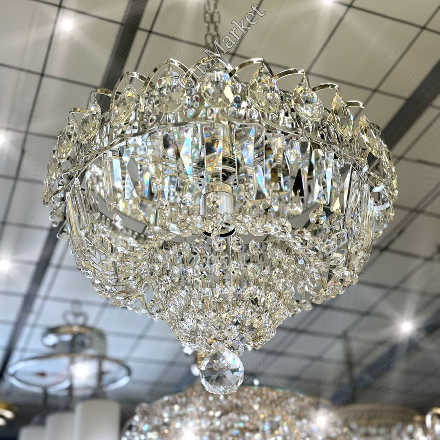 Хрустальная люстра "Катерина", сборка купол. Люстра с зеркалом, производство г. Гусь-Хрустальный. Возможно добавление цветного камня. Люстра поставляется в собранном виде. Крепление крючковое.