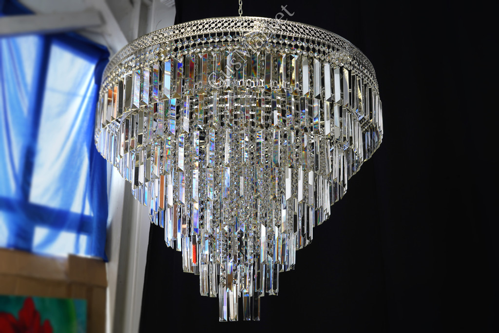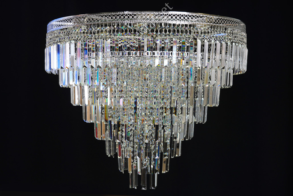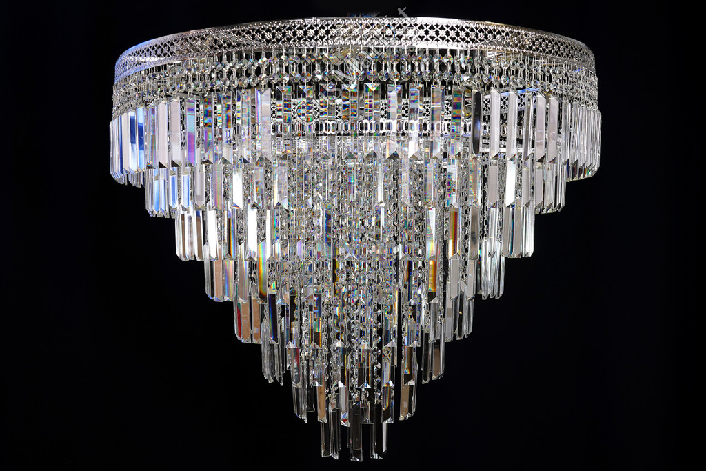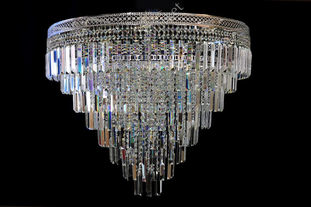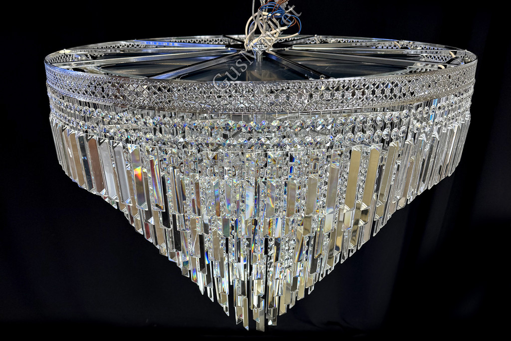 Хрустальная люстра г. Гусь-Хрустальный. С зеркалом. Крепление на крючок. Поставляется в частично собранном виде. Отдельно упаковываем хрустальные пластины. Окончательную сборку рекомендуем проводить на уже установленную люстру. Сборку следует начинать из центра, с нижнего ряда. 1й, 2й, 3й, 5й, 6й (считаем из центра) ряды - пластина устанавливается на каждую цепочку. 7 ярус - пластину вешаем через три отверстия, 8й ярус (наружний) через одно цепочку.